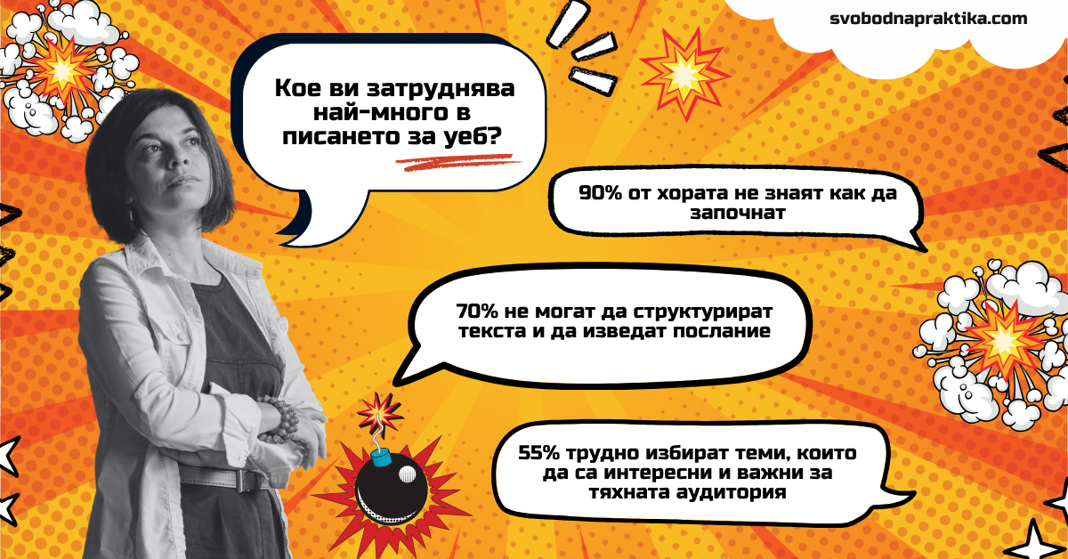 Последните две седмици питах абонатите на „Свободна практика“, както и хората, които следят мен и блога във Facebook и LinkedIn кое ги затруднява най-много в писането за уеб. Ето кои три основни проблема се оформиха, когато получих отговорите. (Благодаря на всички, които ми писаха!)