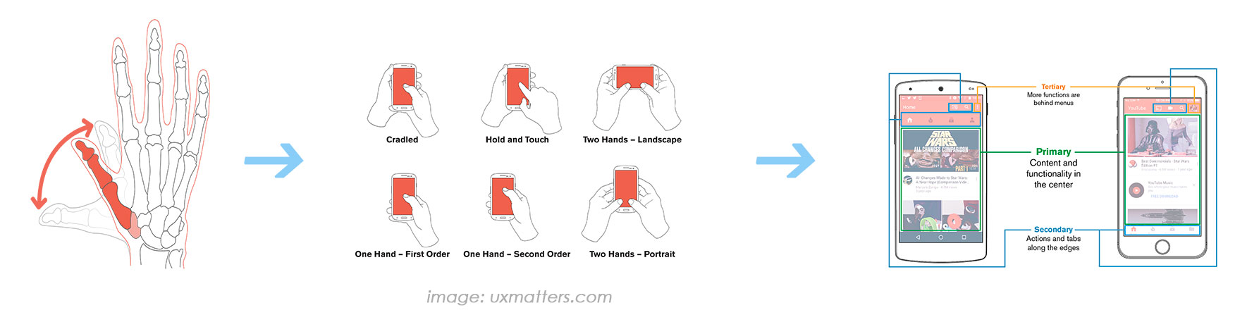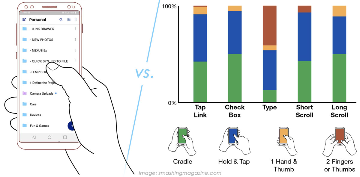 - Не забравяйте, че на мобилна версия пръстът е над екрана при скрол, но при четене и по-задълбочено възприемане на информацията, той пречи и обикновено е отстрани на устройството (или в краен случай над долната част на екрана). Затова правете важните кликаеми елементи (особено бутоните) достатъчно широки, за да се достигат удобно с по-късо движение и с двете ръце, и от различни позиции.