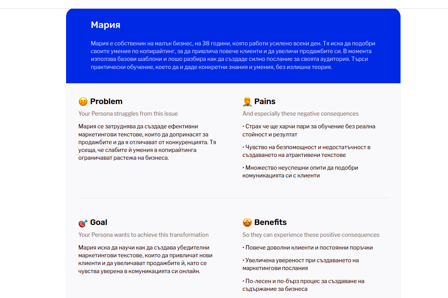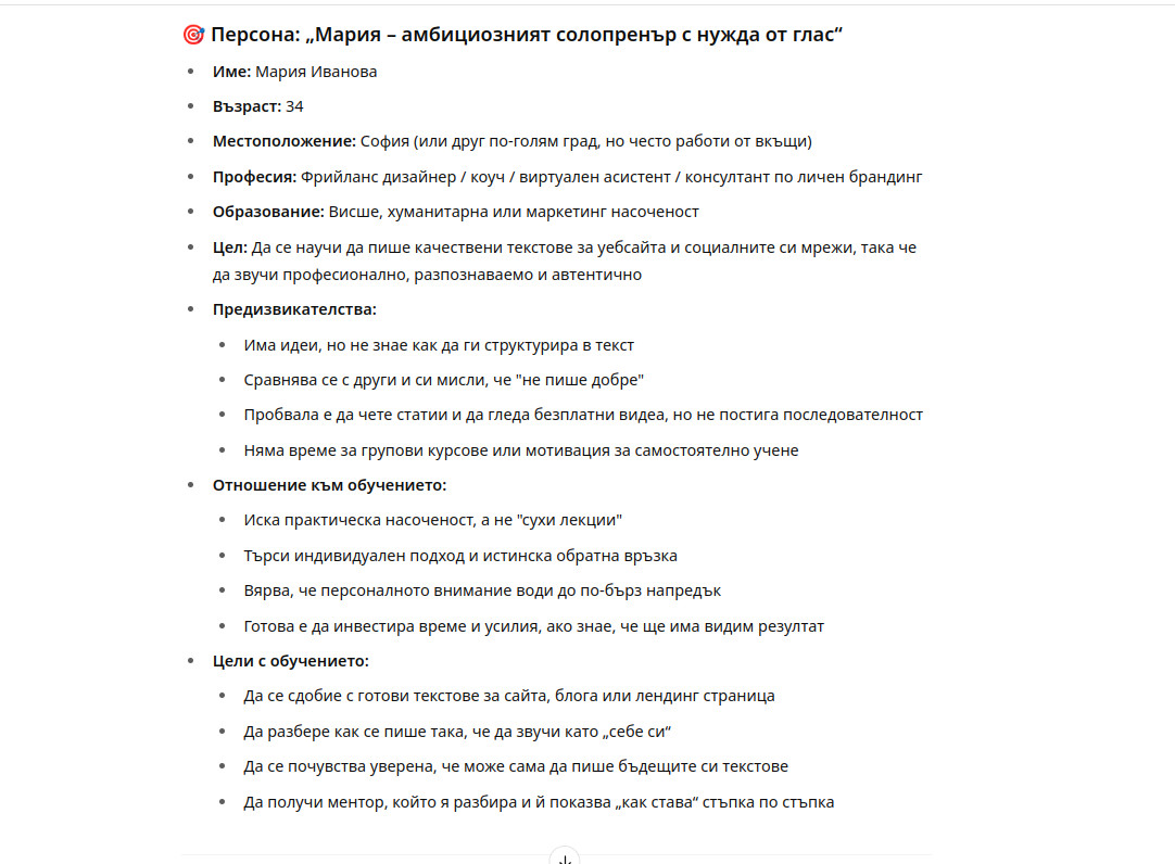 По-близко е до истината, но персоната е изключително повърхностно направена и реално няма как да ми помогне за създаване на смислено, наистина полезно съдържание, с което да привлека курсисти.