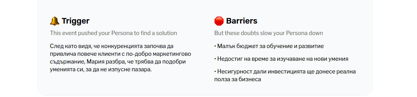 ⇒ Второто е, че и тук, както и при предишните инструменти, резултатът си остава повърхностен и недостатъчен за изработката на истинска персона. Липсват цели секции, не са засегнати важни въпроси. За това обаче не е виновен ChatGPT.