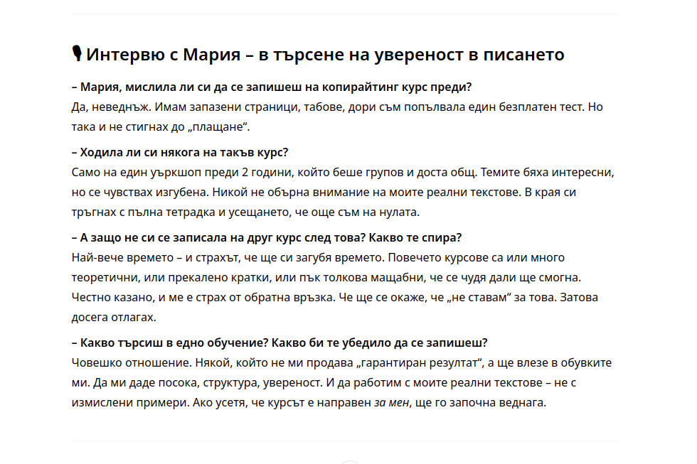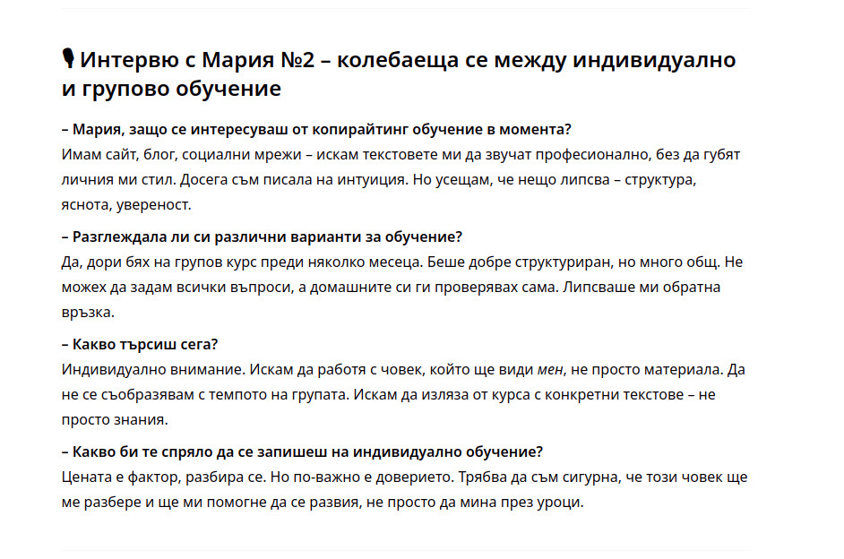⇒ Свържи се с мен, ако имаш нужда от индивидуално копирайтинг обучение или консултация при създаване на юзър персони.