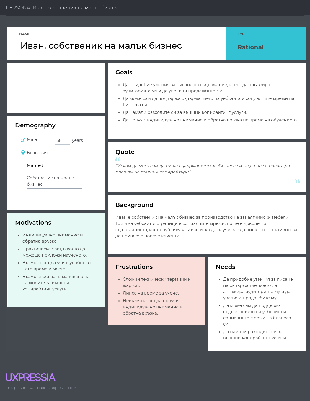Припомням накратко какво е юзър персона: тя е събирателен образ, средният представител на група твои клиенти и в нея са анализирани и обобщени техните болки, проблеми, тревоги, желания по отношение на твоя продукт/услуга/съдържание в уеб. Персоната има име, снимка, възраст, семейно положение, доходи, местоживеене, трябва да се актуализира периодично и е най-добрият ти приятел, ако искаш да създаваш наистина полезно съдържание, което се намира лесно и бързо превръща посетителите в клиенти.